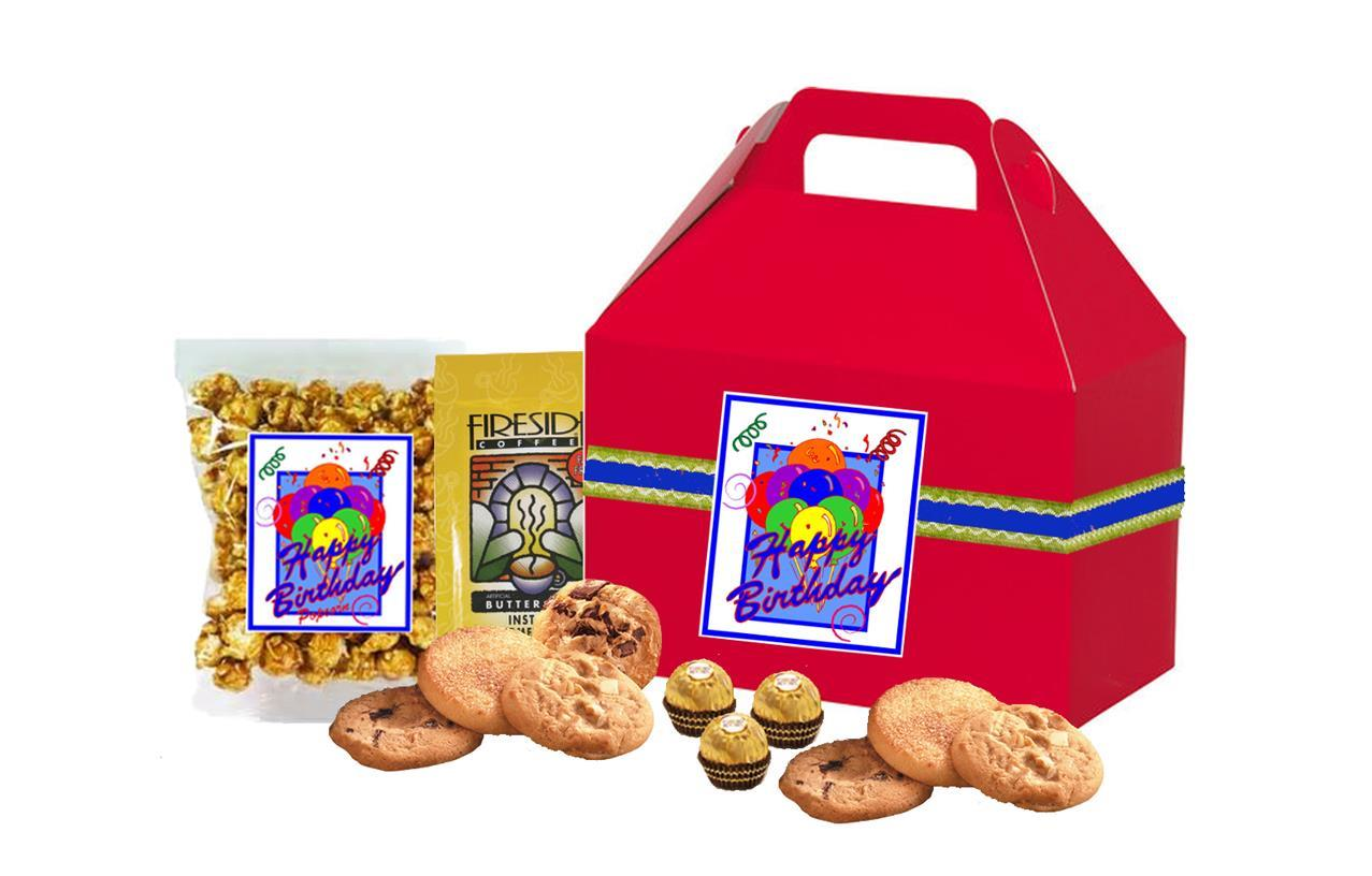 This gift is filled with delicious cookies, gourmet cocoa, flavored coffee, happy birthday popcorn, and chocolate delights.